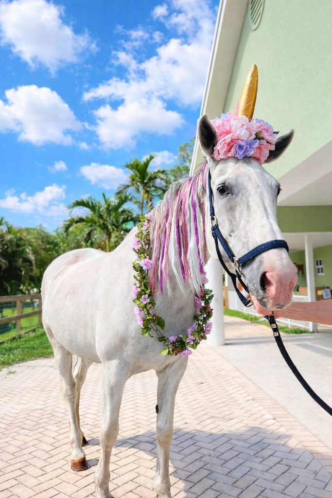 Our white horse, Aries, is dressed as a unicorn for petting, interaction, and photo opportunities