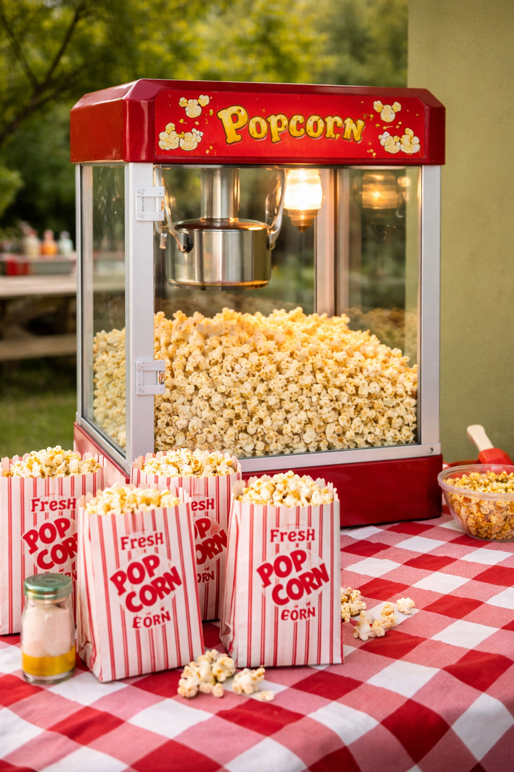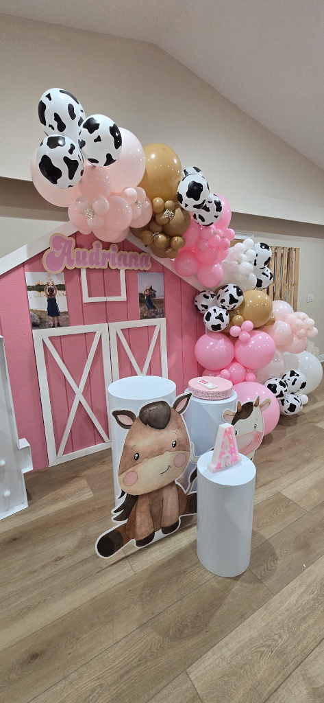 Tables, chairs, gingham tablecloths (blue, red, or pink), barnyard backdrop & decor, and JBL speaker